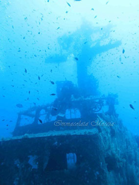 Arrivati a destinazione si parte con il briefing visiteremo proprio questo relitto, non vedevo l’ora di entrare in acqua, Alex decide di seguire il fondale che dai 12 metri a poco a poco degrada fino ad arrivare al relitto, un giro veloce sulla poppa e poi si ritorna, per poi vedere il restante nella seconda immersione. Quindi si scende, un tuffo nel blu, la visibilità è sempre eccellente, tutti in acqua dopo qualche impedimento da parte di uno dei corsisti, che a stento riesce a tenersi in assetto, la guida comincia ad avviarsi, e noi lo seguiamo, pinneggia vigorosamente, un po troppo per i corsisti che non riescono a stargli dietro, controllo il computer stiamo a metà strada per il relitto e sono passati 8 minuti, a quanto pare dista molto, continuiamo la traversata e finalmente intravedo una sagoma scura nell’acqua, riguardo il computer 16 minuti ci abbiamo messo ad arrivare fino a qui, sono un po stanca, decido di scattare la prima foto, mi giro per controllare il gruppo e noto che stanno già andando via, Alex non si è visto proprio, ne tantomeno si è preoccupato di avvisarci, penso che sia impazzito, si ritorna indietro, guardo l’aria 150 bar, inoltre becchiamo la corrente contro, maledizione di male in peggio. Penso che appena uscirò dall’acqua gliene dico quattro alla guida. Vedo le bolle, parto in uno sprint di pinneggiata e raggiungo Alex, che sta facendo la condivisione dell’aria con un corsista. Oramai siamo nella baietta, safety stop a 5 metri per 3 minuti e risalgo. Tra imprecazioni mie, la guida mi dice che arrivati al relitto il corsista aveva 60 bar, e quindi è dovuto tornare subito indietro. Resta comunque il fatto che è stata proprio la guida a sbagliare sia il profilo d’immersione che il sito, in quanto non si possono portare dei corsisti su un relitto che dista cosi tanto, e il profilo d’immersione avrebbe dovuto prevedere la pinneggiata entro i 5/10 metri e poi arrivati sul relitto discendere a 30 metri. È pur certo che se tornerò a Malta non passerò di nuovo in questo diving, che si è rivelato poco competente.