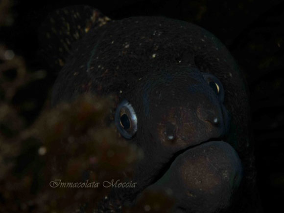 Pinneggiamo per un po, la guida ci segnala il punto in cui discendere, che emozione, è una meraviglia, sul fondale vedo il blu e mettendo a fuoco la vista, intravedo i contorni del relitto, ma che suggestione scendere e vedere l’ albero del relitto, arrivo a prua, c’ è uno spirografo, ma intendo fare un giro tra il relitto, a volte si nascondono tante creature marine, e infatti vedo una grossa cernia che gioca a nascondino, maledizione effettuo uno scatto ma gli taglio la testa, continuando a scovare, trovo una murena, imposto tempo e diaframma e scatto cercando di non spaventarla troppo.