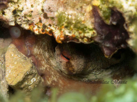 Proseguendo cominciamo a vedere delle anfore, la guida chiede l’aria a tutti, qualcuno è arrivato a 100bar, quindi torniamo indietro, tornati nella baietta entro i sei metri, mi dedico a ricercare negli anfratti, trovo alcuni soggetti che non ho mai visto: Fireworm, ce ne sono un sacco in giro, mi piacciono sono molto belli. Tento di fare una macro indisposta, ci riesco. In un altro anfratto trovo un polpo, si è attaccato dei sassi sulle ventose, provo a spostarne una per fare una foto più bella, ma lui forte e incazzoso, non ne vuole sentire di mollare. Quindi decido di scattarla cosi, l’occhio si vede, quindi un pò di zoom e via.
