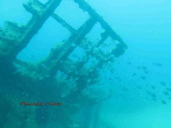 adrenalina a mille, non vedo l’ora di immergermi e sono molto curiosa di vedere il relitto, che solitamente mi piacciono molto, anche se quelle che preferisco sono le grotte. Cmq dopo aver messo le pinne, tutti in acqua, siamo due coppie di sub più la guida, partono i segnali, ok si scende, metto la maschera in acqua, wow ma è magnifico la visibilità è ottima ed è tutto così limpido. Ci troviamo in una baietta, il profilo d’immersione della guida era stare entro i cinque mt, e pinneggiare fino al relitto, per poi discendere sulla prua che si trovava a 32mt, fare un giro intorno al relitto per poi ritornare gradualmente entro i 10mt, fare una ricerca tra gli anfratti per me che avevo la fotocamera, per poi risalire entro i 5mt, safety stop per la sosta di sicurezza di 3min.